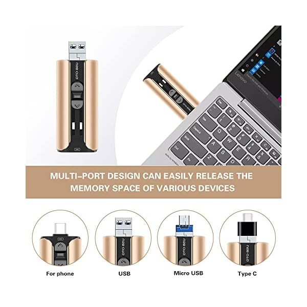 Multi-Port usb drive:The usb stick with usb/iphone connection port/micro usb/type c (independent adapter) four interfaces,which is more convenient for data transfer between different devices, so as to get rid of the data cable and iTunes and iCloud, let you switch easily storage space.